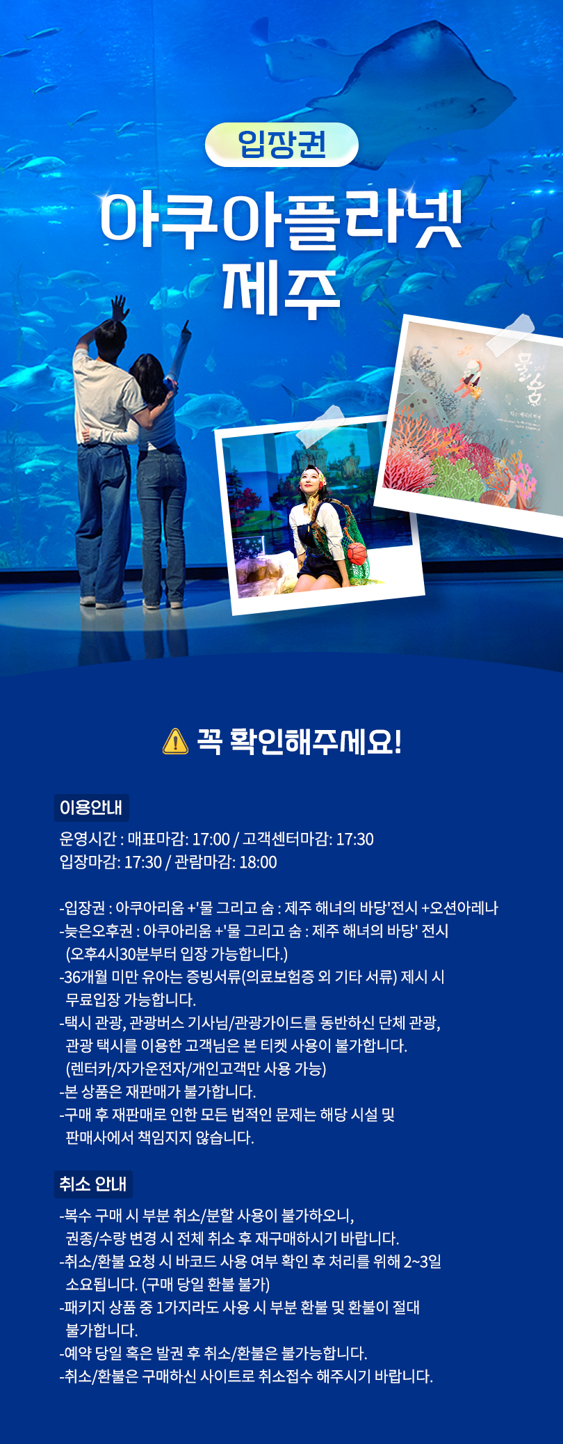 본 상품의 입장권은 아쿠아리움 + 오션아레나 + '물 그리고 숨 : 제주 해녀의 바당' 전시 이용이 가능합니다.
