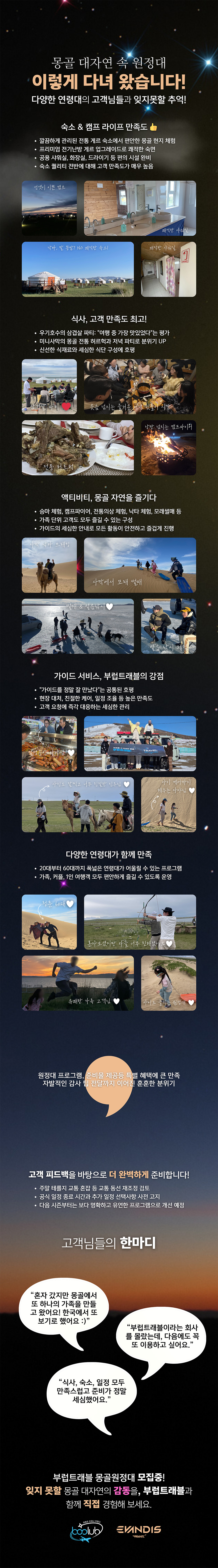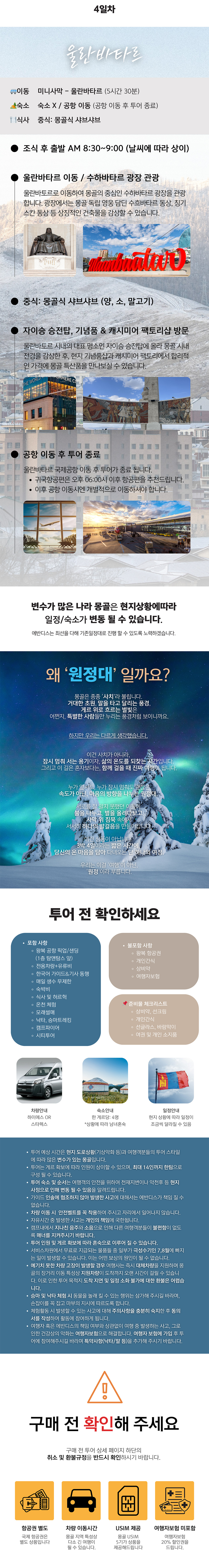 몽골 현지 날씨나 교통 사정에 따라 일정이 일부 변동될 수 있습니다. 변동이 필요한 경우, 베테랑 몽골 현지 가이드가 상황에 맞춰 가장 좋은 방향으로 일정을 조율해 드립니다.