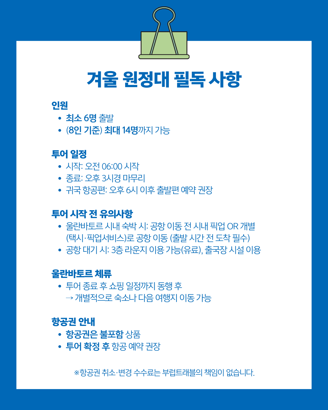 예약이 완료되면 몽골 담당자가 개별 연락을 드려 준비물 안내, 일정 확정, 현지 팁 등을 포함해 출발 전 준비를 도와드립니다. 이때 궁금한 사항이나 필요한 준비물 관련 문의도 자유롭게 하실 수 있습니다.