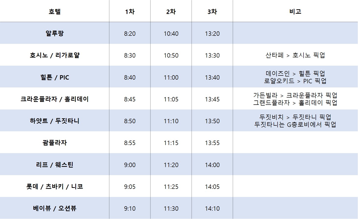 픽업시간은 위 표를 참고하시고, 정확한 픽업시간은 확정 후 안내드리는 바우처를 확인하여 주세요.