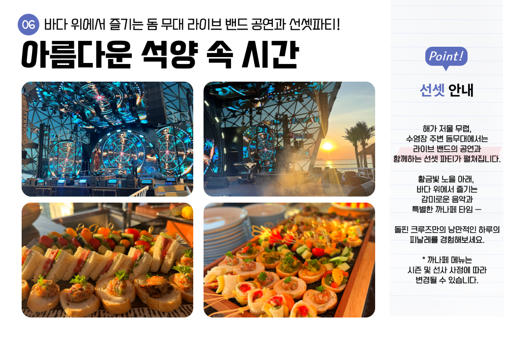 타 크루즈에 비해 늦은 픽업 시간다양한 부대 시설을 갖춘 크루즈를 가성비 있게 이용 가능해요!