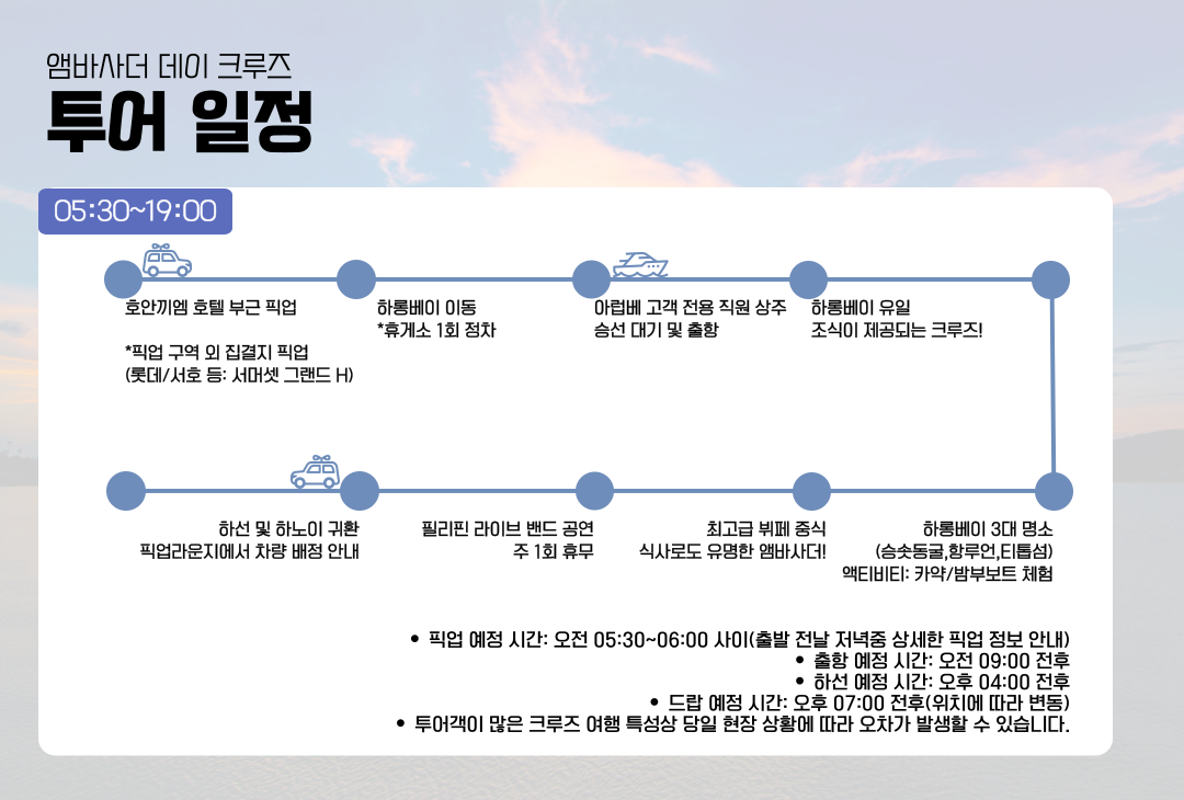 • 상세 설명의 일정으로 이루어지나 당일 크루즈 상황에 따라 소폭 변경될 수 있습니다.