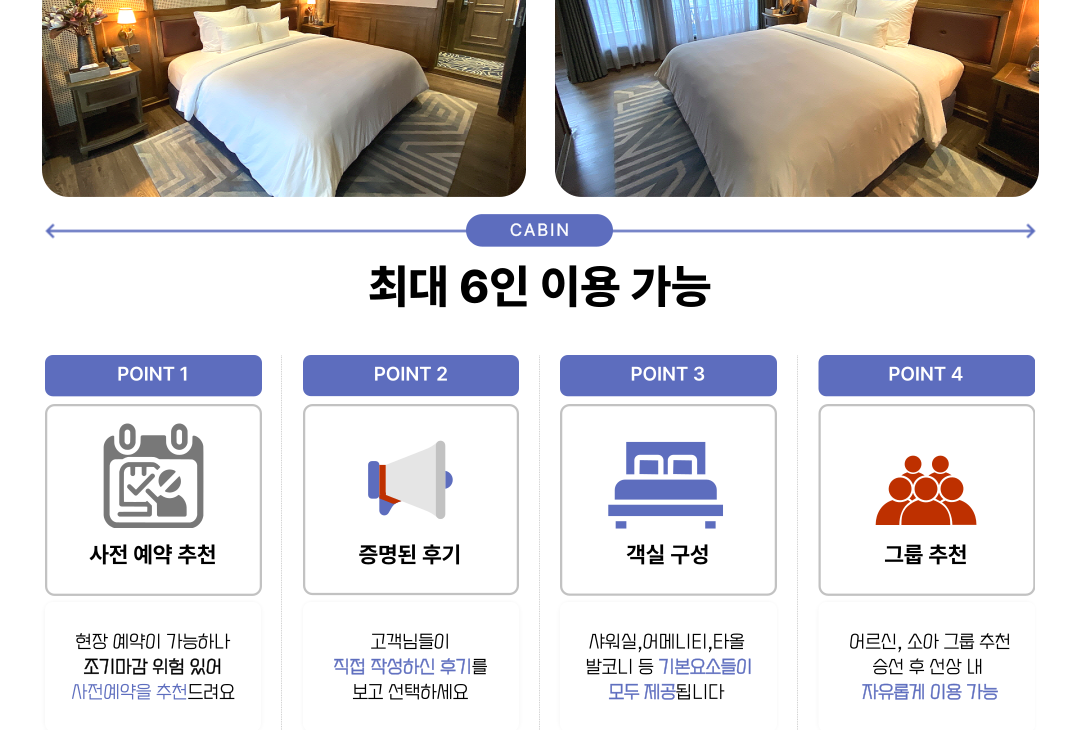 날짜의 변경, 베드 타입 변경 등은 최초 1회 무료로 가능합니다.(변경이 가능한 경우)