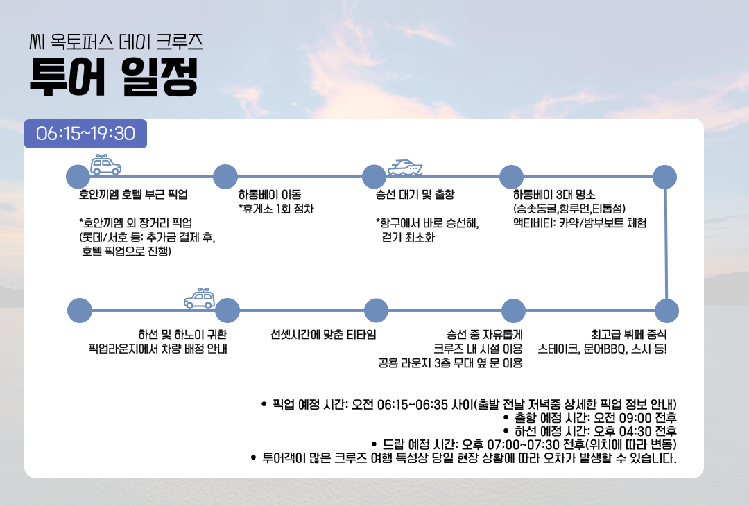 • 상세 설명의 일정으로 이루어지나 당일 크루즈 상황에 따라 소폭 변경될 수 있습니다.