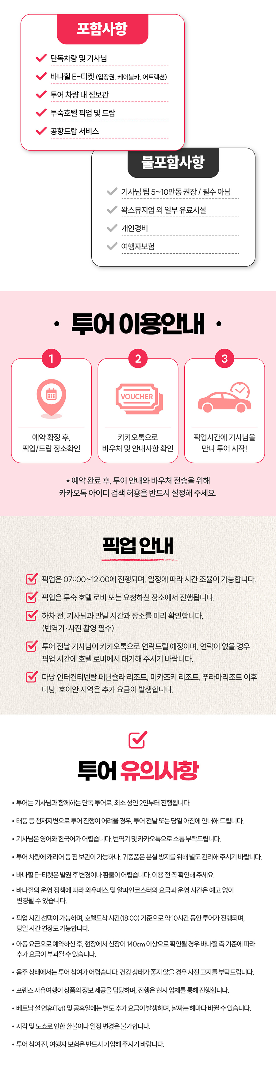 1. 픽업미팅(07:00~12:00) ♦ 1. 픽업 시간 10분 전에 투숙호텔 로비에서 대기를 합니다. ♦ 2. 픽업 시간에 기사님을 만나 차량에 탑승합니다. 2. 바나힐(~17:00) ♦ E-티켓 QR코드를 스캔해 바나힐에 입장한 후 케이블카를 탑승합니다. ♦ 골든브릿지, 프랑스마을, 링엄사에서 자유시간을 가지며 여유롭게 둘러봅니다. ♦ 약속 시간 30~40분 전에 케이블카에 탑승합니다. ♦ 케이블카 탑승 전에 기사님께 카카오톡 메시지를 보냅니다. 3. 투어종료 ♦ 투숙호텔 또는 공항으로 안전하게 이동하여 투어를 종료합니다.