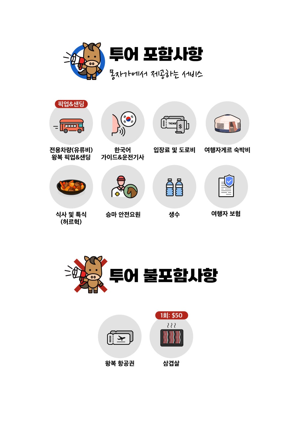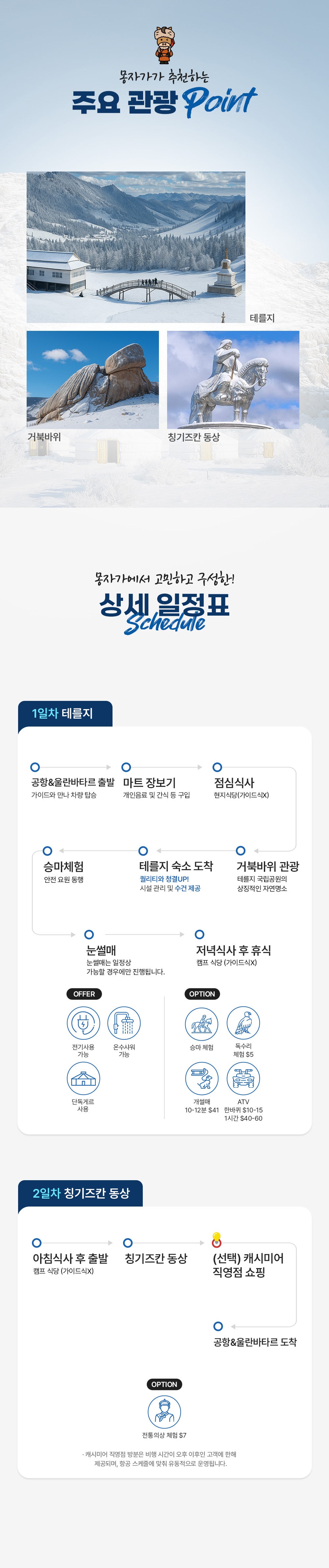 온천,은하수,모래썰매,낙타,보트탑승,승마,독수리,칭기즈칸동상,쇼핑